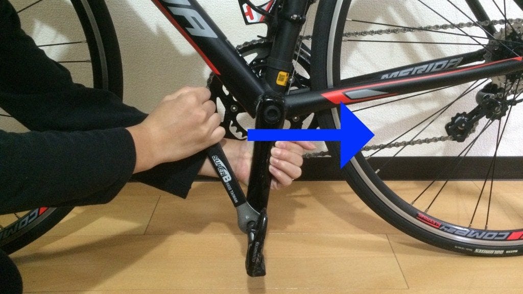 「進行方向に対して右側についているペダルは右ネジ」なので左方向へ回せば緩みます。