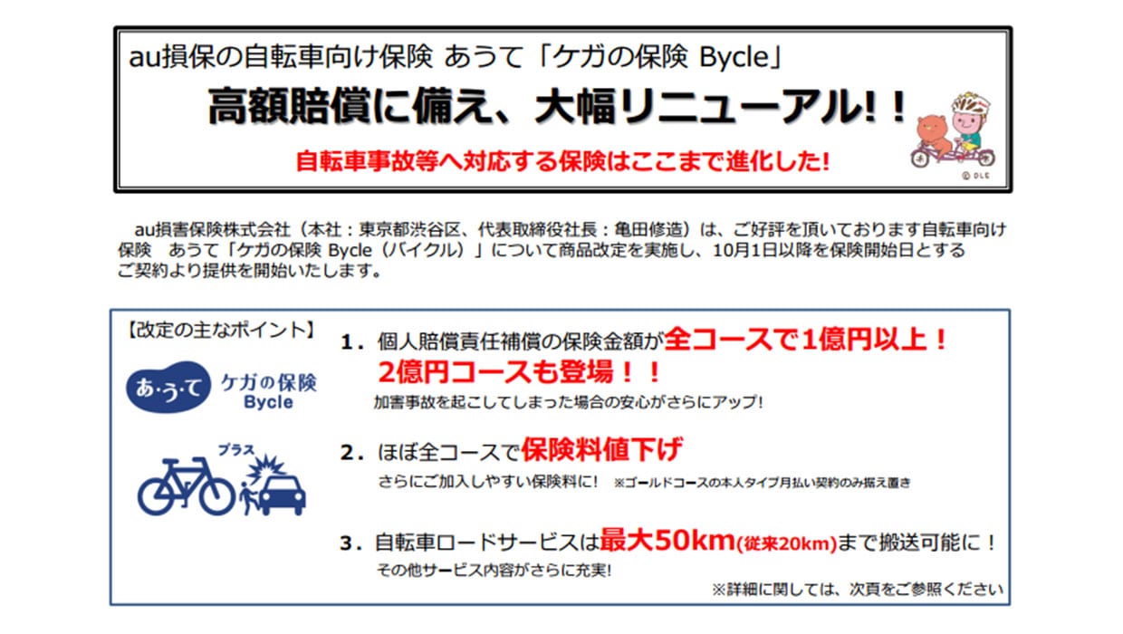 au損保の自転車向け保険が大幅リニューアルしたようです。