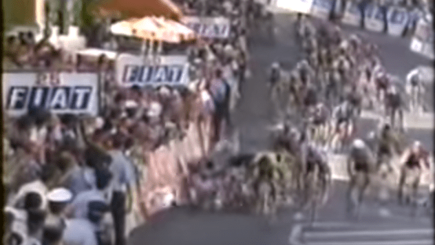 警官が選手と衝突し、選手は落車・大怪我を追う大惨事です。