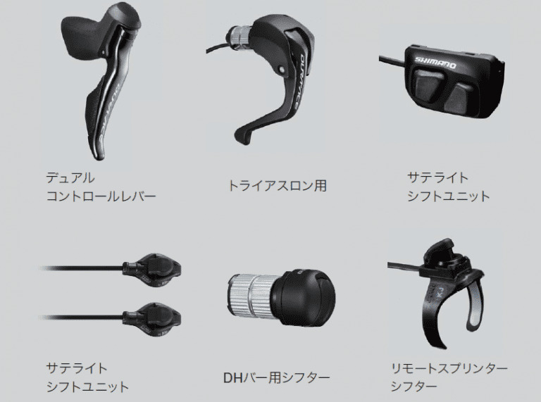 Di2システムでは、様々なライディングに応えるシフトスイッチを用意しているのも特徴的だ。基本となるデュアルコントロールレバーの他、トライアスロン用、DHバー用、サテライトシフトユニット、リモートスプリンターシフターがある。