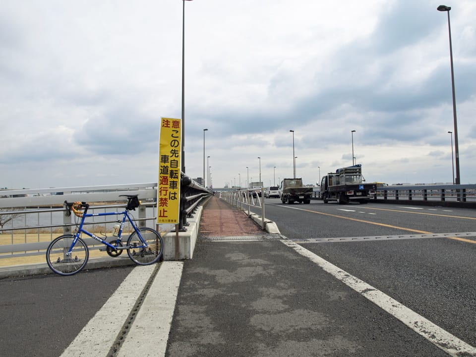 小松川大橋で荒川と中川を渡河。この橋の車道は自転車通行不可なので、FELUCAを押しながら歩道へ通じる階段を上り下りします。高所恐怖症にはツラい高度と北風。