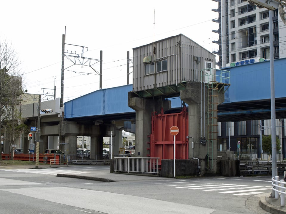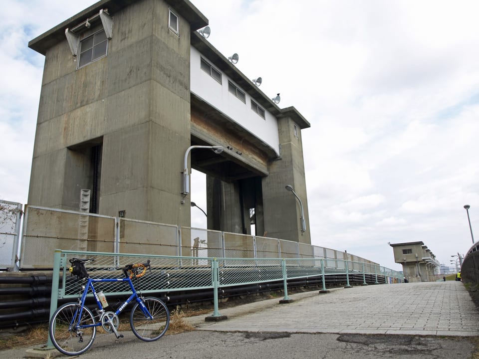 稲毛海浜公園の先で道が途絶えてしまうので、千葉中央市場の前で左折して街のほうへ向かい、京葉線に沿った通りで南下。千葉みなと駅の手前で唐突に水門と遭遇しました。