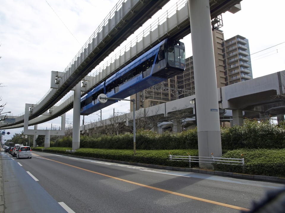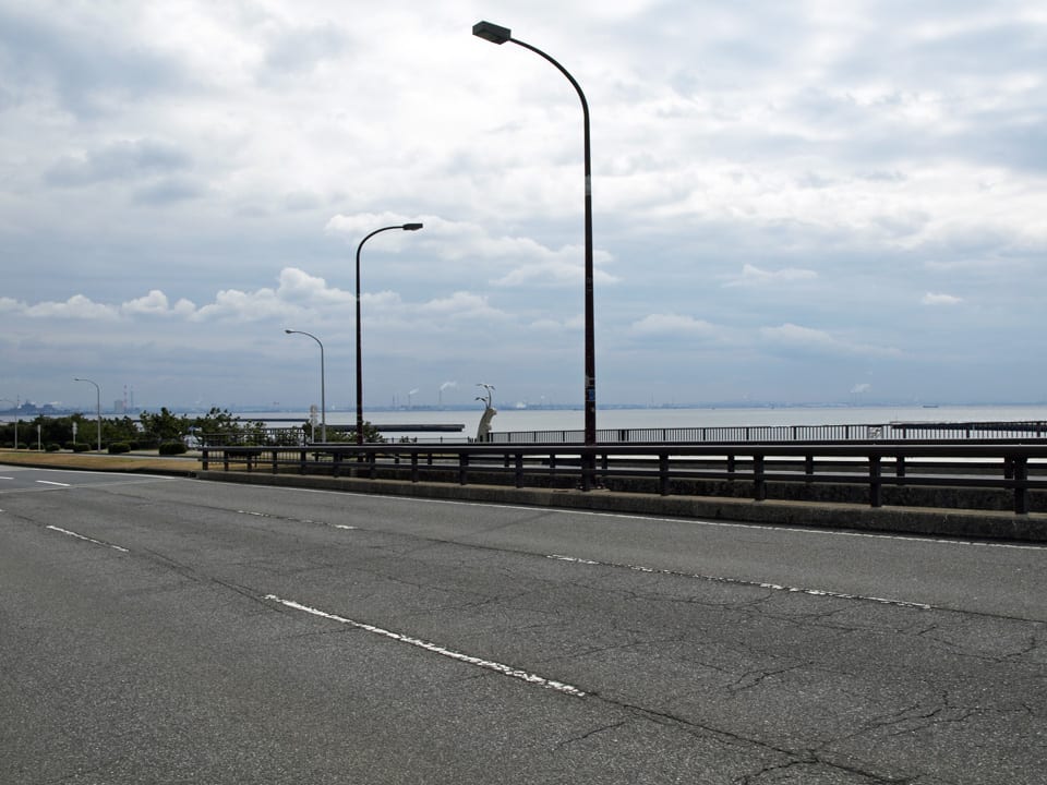 そのまま走っていると、通りの端に千葉都市モノレールが登場。港町の風景に都市整備された区画が混じり、そこをモノレールが通り抜ける。何だか不思議な光景です。
