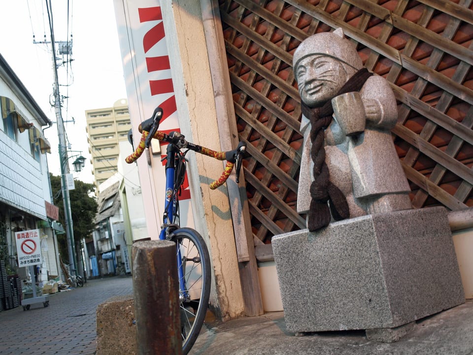 アクア木更津の裏手に回り、ノスタルジックなみまち通り商店街へ行ってみると……。これまた「木更津キャッツアイ」なオジーたぬき像が、酒屋の脇に佇んでました。
