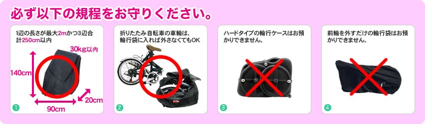 以上を確認すると、「専用の袋」という記載がありますので、自転車には輪行袋が必須ということがわかります。ごく稀にビニール袋やごみ袋を繋ぎ合わせて、即席で輪行袋を作っている人を見かけますが、これは違反です。