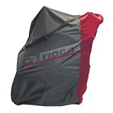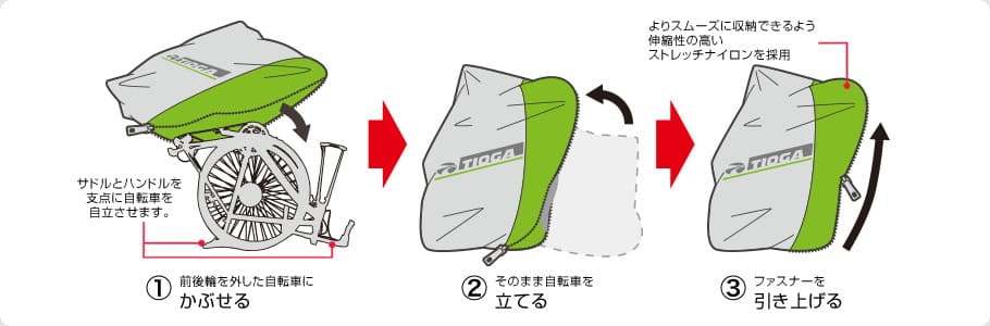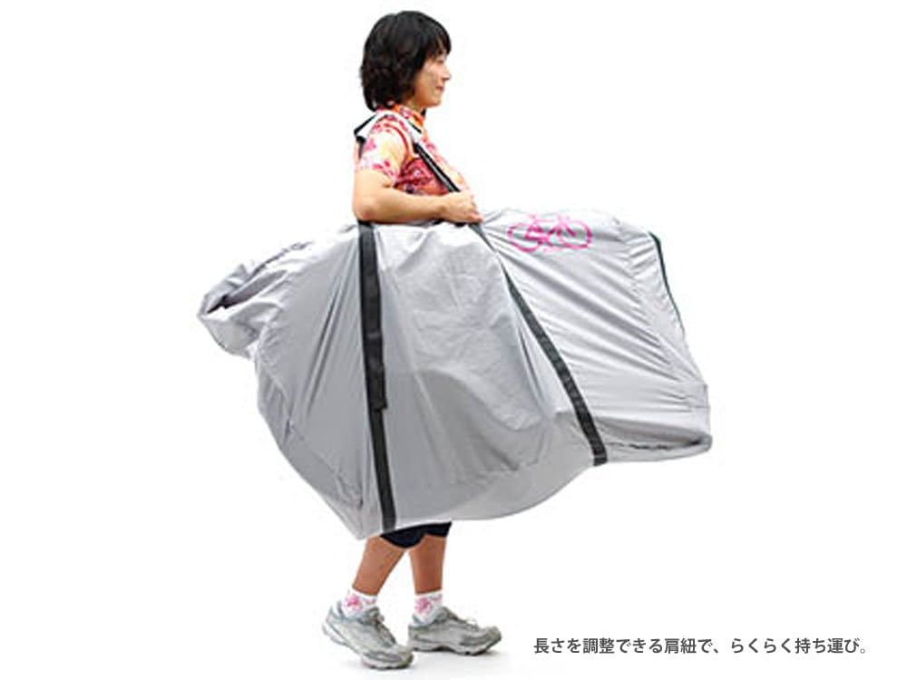 自転車を逆さまにして前後輪を外し、付属のシンチバンドでフレームに固定した後、筒状のシートを固定した自転車にかぶせて、袋の裾を絞るだけのシンプル構造です。内側のポケットが収納ケースとして使用できます。26~29インチに対応。