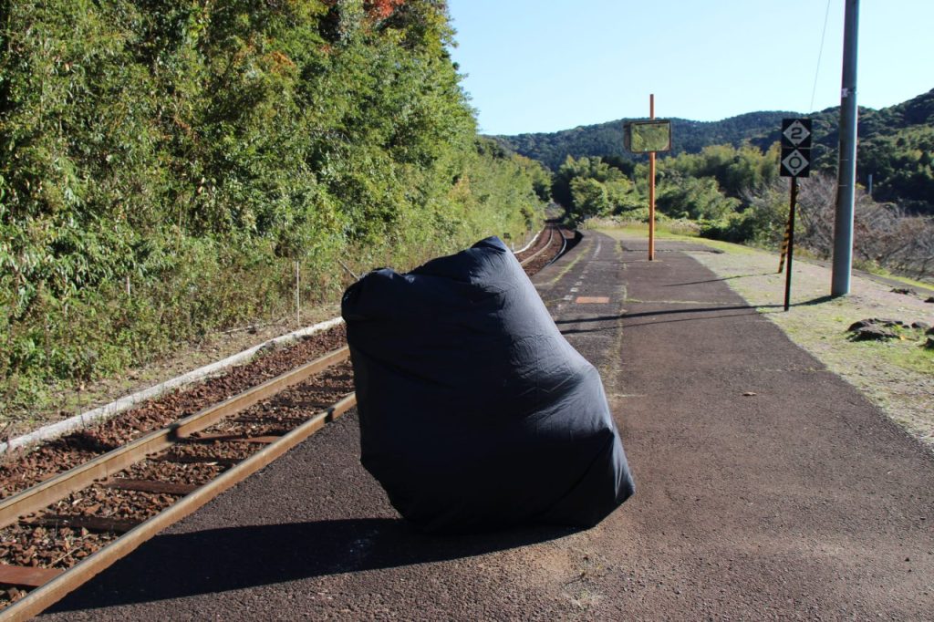 2. 駅前で輪行袋にパッキングをして、列車に乗る