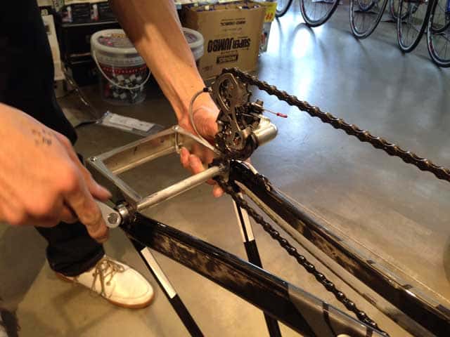 リアのエンド金具はチェーンが暴れないように、チェーンを引っかけて取り付けます。