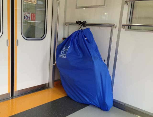列車内では輪行袋に入れて、車両の前後などのスペースへ。