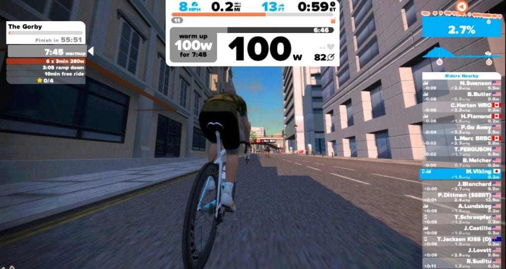 画面右上はコースマップと勾配度、その下は現在ZWIFTを楽しんでいるユーザーの名前が記されています。これを見ると世界各国のユーザーがいることがうかがえます。
