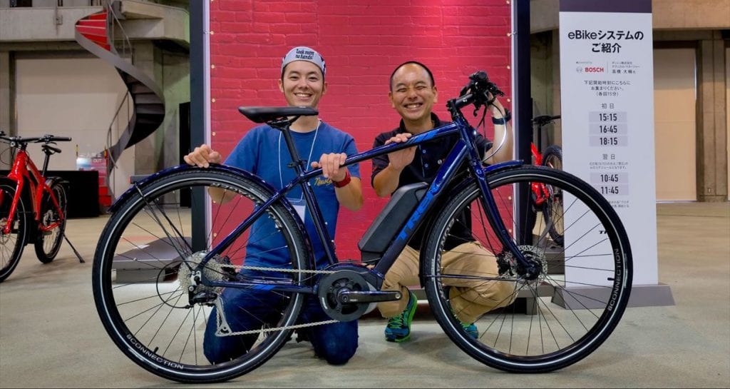 けんたさんがおもわずニマニマしちゃっているこの「一見クロスバイク」、よく見るとダウンチューブのところにグレーの四角いものがついていますよね。実はこれ、トレックが日本で今年ついに発売を開始するスポーツタイプの電動アシスト自転車なんです。