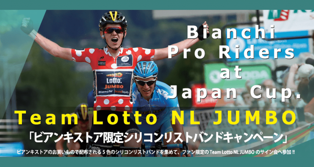 サイクルヨーロッパジャパン株式会社は、10月21日、10月22日に開催されるジャパンカップサイクルロードレースへ出走が決定した「Team Lotto NL Jumbo」の来日キャンペーンの第2弾として、ビアンキストアで税抜3000円以上購入した方に、特製シリコンバンドをプレゼントするキャンペーンを開催する。