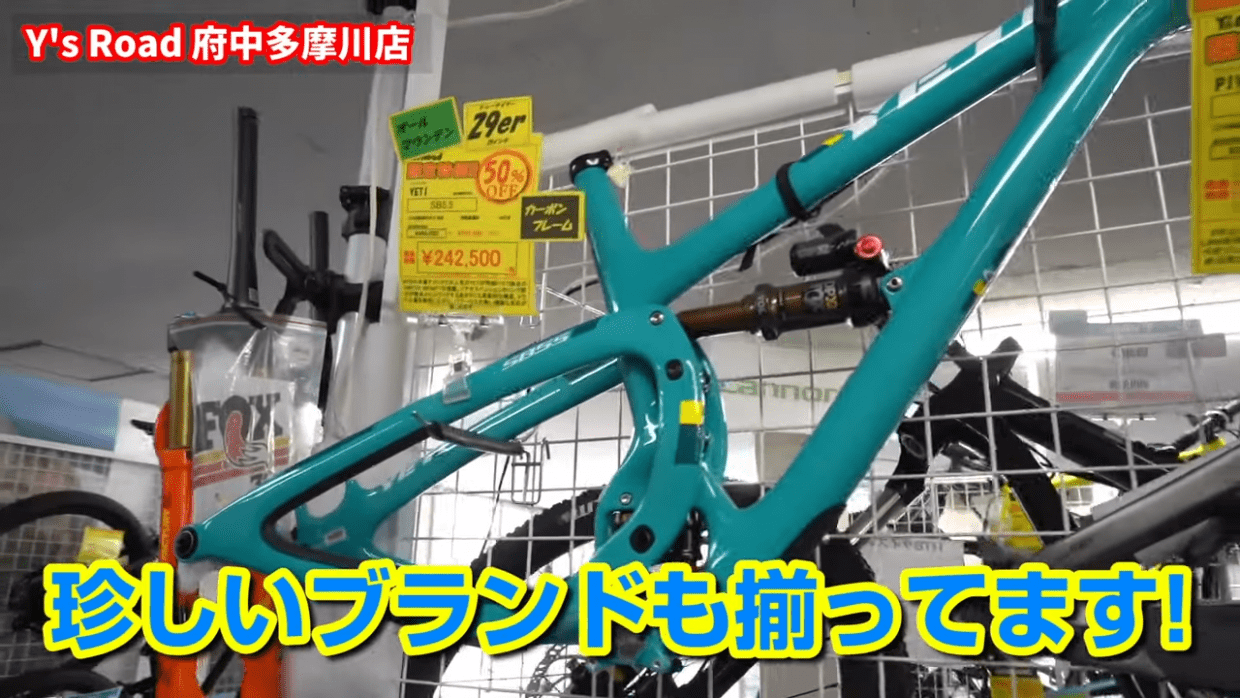 マウンテンバイクコーナーには完成車だけでなくフレームも。YETI(イエティ)など珍しいブランドもそろっています。非常に珍しいモデルなので、興味のある方はぜひ見てみてください!