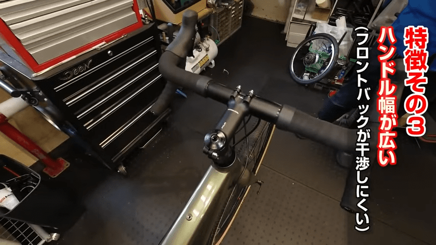 ハンドルの位置がロードバイクに比べてかなり高くなっていることも特徴のひとつ。前傾姿勢をとったときに、体が起きて楽な姿勢で乗れます