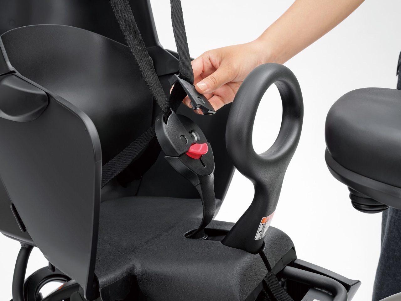 特に私が素敵だなと思った機能は自立式の「マグネットバックル」。子供乗せ電動アシスト自転車はベルトを留めるバックルが自立していないものも多く、子供を乗せてからバックルをする際に子供がバックルをお尻で踏んでしまって、手こずることがあります。