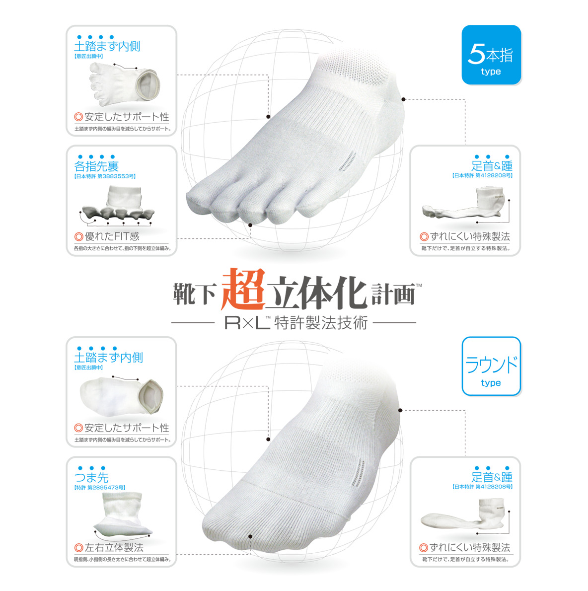 武田レッグウェアー株式会社は1997年世界で初めてつま先部が靴のように左右に分かれている靴下の開発&生産に成功。1998年に日本国で特許を取得し、今後のグローバル化に備え欧米やアジア等の特許を取得し、世界中のスポーツ愛好家にもっと笑顔になるソックスをとの考えを基に、『R×L(アールエル)』 のブランディングがスタートした。