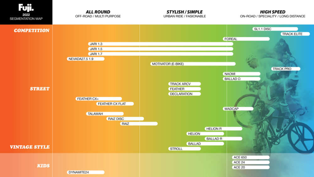 FUJIの2022年モデルは、ニューモデルの追加やモデルチェンジと行った大きな動きはなく、新色の追加やカラーの変更と行ったマイナーチェンジが中心。しかし、それだけ完成されたラインナップだったと考えることもできる。