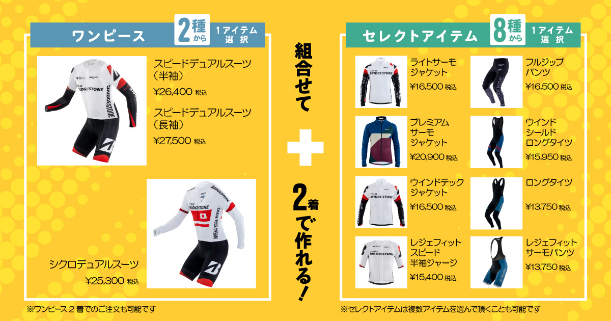「スピードデュアルスーツ」あるいは「シクロデュアルスーツ」と、「セレクトアイテム」内の1アイテムのセットで、 計2着からオリジナルデザインのウエアを作製できる。アップチャージやオプション料金も不要で、個人で のシクロクロス参戦や、最小ロットをクリアしにくいアイテムの作製を応援するキャンペーンとなっている。