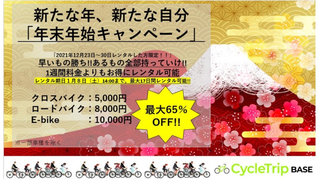 年末年始に向けてCycleTrip BASEは、来店の利用者限定でキャンペーン対象車両のレンタル料金を最大65%OFFにする。2021年12月23日から12月30日までの期間内に来店するだけでレンタル料金は最大65%となりお得な価格でのレンタルが可能だ。