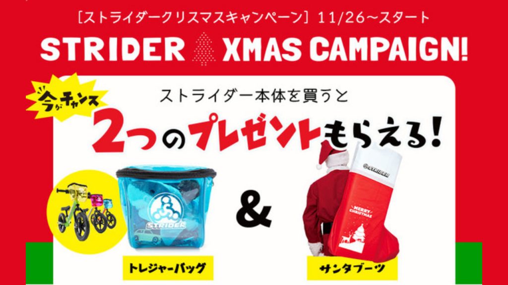 株式会社Ampus(本社:東京都杉並区、代表取締役:岡島和嗣)が運営するストライダージャパンは、2021年11月26日(金)より、対象のストライダーをご購入いただいた方へ、トレジャーバッグとサンタブーツの両方がもらえるキャンペーンを開催する。数量限定、無くなり次第終了のため、全国のサンタさんお早めにお求めを!