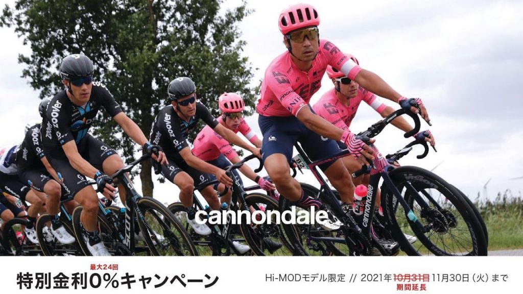 キャノンデール・ジャパン株式会社(本社:大阪府吹田市、ジェネラルマネージャー:樫村浩史、以下キャノンデール)は「キャノンデール特別金利0%キャンペーン」を好評につき2021年11月30日(火)まで期間を延長して実施。対象車種は、EFエデュケーション・NIPPOのライダーたちも使用するSystemSixHi-MODとSuperiSix EVOHi-MOD(フレームセット含む)の2モデル。支払回数は最大24回払いまで可能。例えば、月々のお支払い25,600円(初回27,200円)で、大人気のSuperSix EVO Hi-MODチームカラーを手に入れることができる。憧れのHi-MODを賢く購入できるチャンスだ。