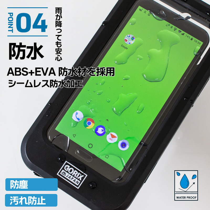 自転車用スマホホルダーはABS+EVA防水材を採用。シームレス防水加工で全面的に防水。急に雨が降っても安心。※完全防水ではない。
