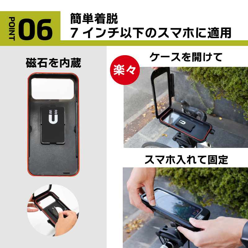 - 商品内容:スマートフォンホルダーケース本体、ブラケット、六角工具、マグネットシールパッド、日本語説明書