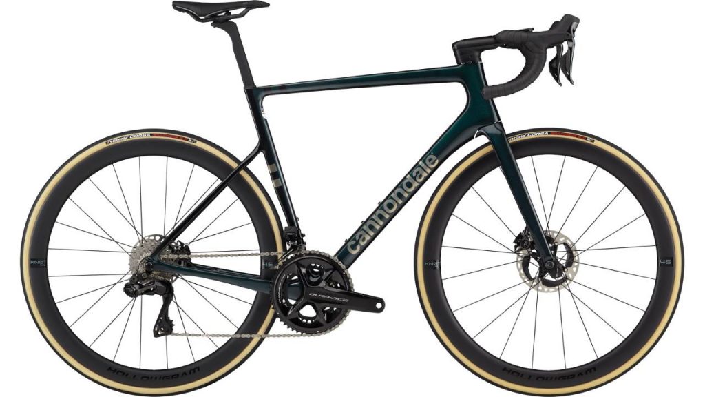 深い輝きが特徴のガンメタルグリーンを纏った新型デュラエース搭載マシン。キャノンデールのエアロパーツKNØTをステム、シートポスト、ホイールに採用。レーシングバイクでありながら、高い快適性を実現。ギアは前52/36T、後11-30T。キャノンデールレーシングバイクのフラッグシップモデル。