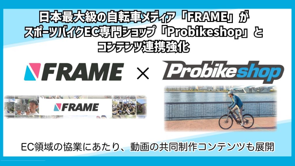ECサイトへの送客実績が豊富な「FRAME」 を通じて、「Probikeshop」の認知向上と売上最大化を図ることが本業務提携の目的だ。その手段として、FRAMEのYouTubeチャンネル「FRAMEチャンネル」にて、共同制作コンテンツを本日から順次公開する。