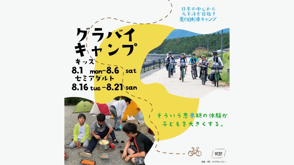 グラバイキャンプは、自分の足で自転車を漕いで山から海まで走る子ども向けキャンプ。宿泊は各地のキャンプ場でテント泊を行い、食事作りも洗濯も、自分の手で行う。自転車冒険家・小口良平の指導のもと、北緯36度東経138度が交わる日本の中心・長野県辰野町から、静岡県富士市の太平洋と新潟県糸魚川市の日本海を目指す。