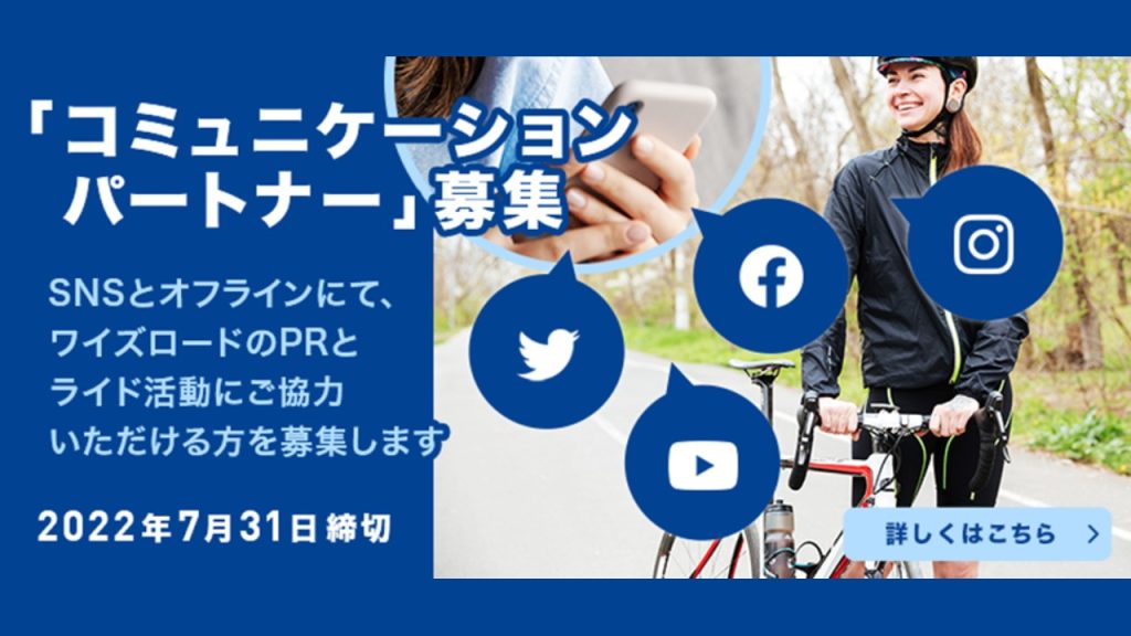 株式会社ワイ・インターナショナル(本社:東京都豊島区東池袋1-27-8、代表取締役社長:鳥居恵一郎)は、ワイズロードのPRやライドイベントをサポートできる「ワイズロードコミュニケーションパートナー」の募集を2022年6月30日(木)より開始する。この度新設する「ワイズロードコミュニケーションパートナー」は、自身のSNSアカウントを使ったPR活動や、オンライン・オフライン問わずライド活動などに協力できる方となる。