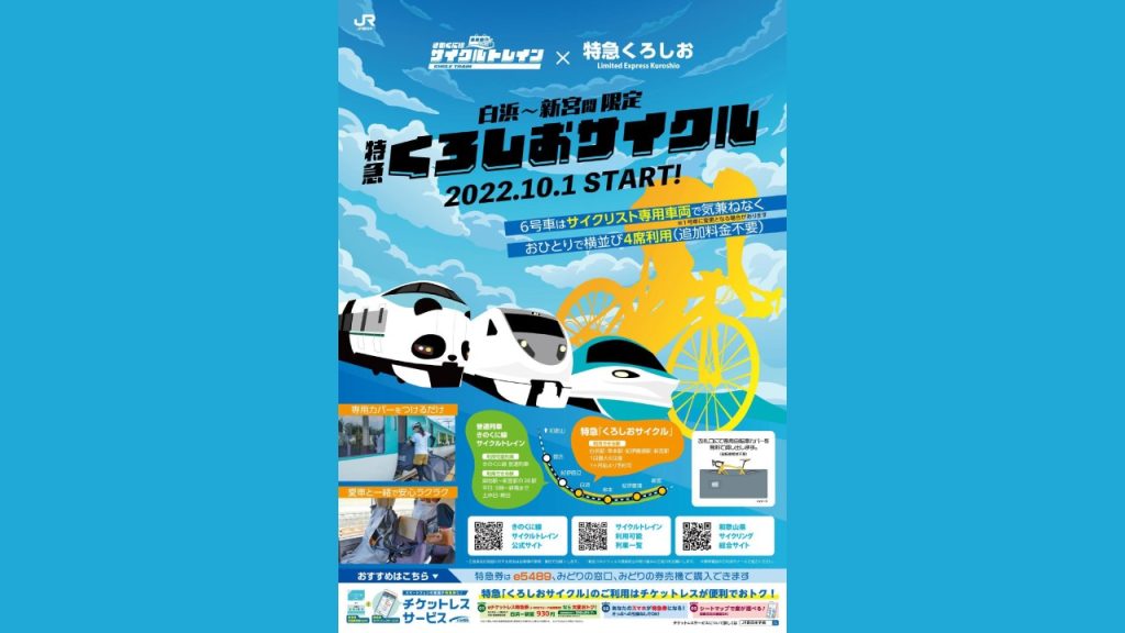 きのくに線では、2021年9月から普通電車に自転車をそのまま持ち込めるサービス「きのくに線サイクルトレイン」を実施し、これまで6,000人超に利用されるなど、好評をいただいている。「電車の本数を増やして欲しい」「特急でも使えると嬉しい」「混んでいるときに気を遣う」など利用のお客様の声を受け検討を重ね、この度白浜~新宮間限定で、特急「くろしお」に自転車を分解せずに持ち込める新サービス「くろしおサイクル」をスタートする。