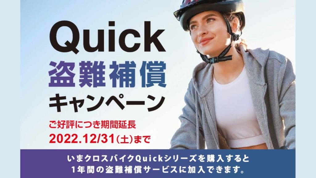 期間中クロスバイクQuickシリーズ(Quick Neo、Quick Disc 3 Rui Edition除く)を購入すると1年間の盗難補償サービスに無料で加入できるキャンペーンを開催します。万が一盗難に遭った場合でも、組立手数料11,000円(税込)のみで、購入車と同等モデルの新車を補償します。
