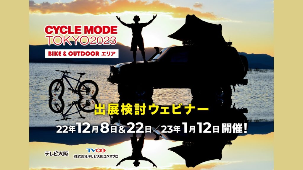 日本最大のスポーツサイクルフェスティバル「CYCLE MODE TOKYO 2023」を、2023年4月15日(土)から16日(日)までの2日間、東京ビッグサイトで開催します。ついてはアウトドア関連企業・団体・自治体を対象とした「BIKE & OUTDOORエリア」に関する出展検討ウェビナーを、2022年12月22日(木)、2023年1月12日(木)の残り2回の受講者を募集しています。