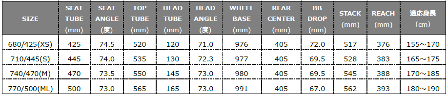 サイズ680 (XS)、710 (S)、740 (M)、770(ML) mm