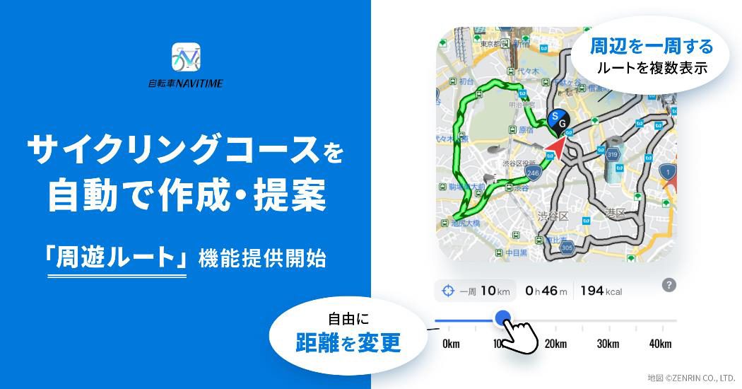 自転車専用ナビゲーションアプリ『自転車NAVITIME』がさらに便利になりました! エリアと距離を指定するだけでサイクリングコースを自動で提案してくれる「周遊ルート」機能が追加。