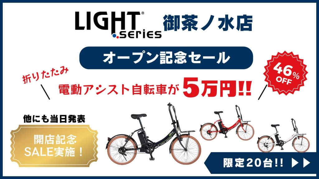 そんなライトシリーズの3号店となる「御茶ノ水店」が2024年3月9日(土)にオープンします。オープンから2日間、20台限定で9万3500円の折りたたみ電動アシスト自転車がなんと5万円になる破格のキャンペーンも!