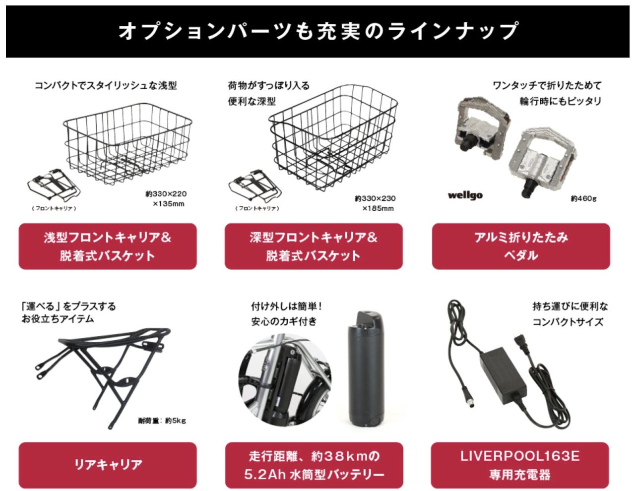 あとは、日常的に使うことを考えて、フェンダーやスタンドを標準で装備しています。オプションパーツとして専用のリアキャリアやバスケットなどもあるので、用途にあわせて選んでいただけます。
