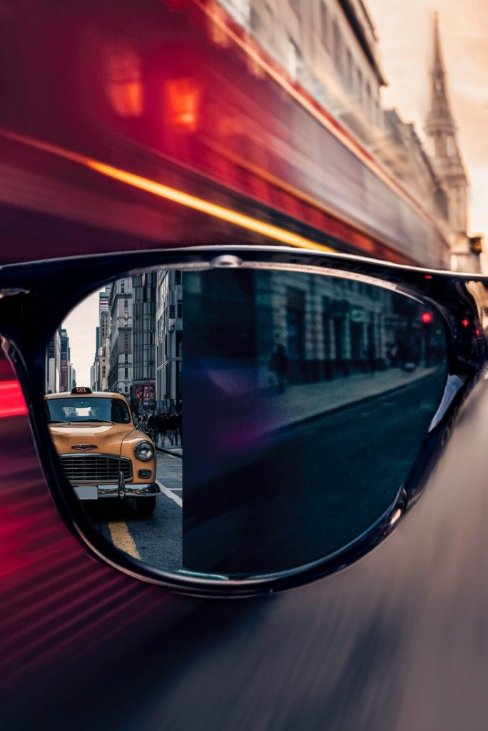 HINDSIGHTのサングラスは、独自のミラー機能を搭載しており、前方視界と後方視界を同時に確保することができます。これにより、前を向いたままでも常に自分の後ろの交通状況を把握することができ、自動車の接近などに一早く気付くことができます。