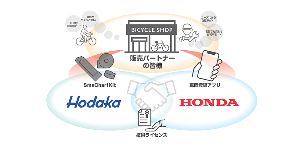 従来の販売形態では、SmaChari搭載モデルの開発・販売にあたり、Hondaとライセンス契約を締結した自転車販売会社と、完成車ごとに共同開発を行っていました。今回、SmaChariの導入に必要な電動アシストユニットとソフトウェアをパッケージ化し、SmaChari Kitとしてライセンス販売することで、より多くの販売店での取り扱いが可能になります。また、各取り扱い店舗がSmaChari Kitを使ってスポーツバイク、シティバイク、小径車(ミニベロ)など、幅広いタイプや価格帯のSmaChari搭載完成車を提供でき※3、消費者選択の幅が広がります。これらにより、より多くの方にSmaChariを利用いただくことが可能になります。